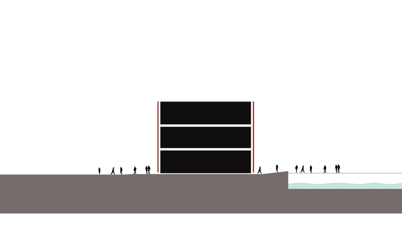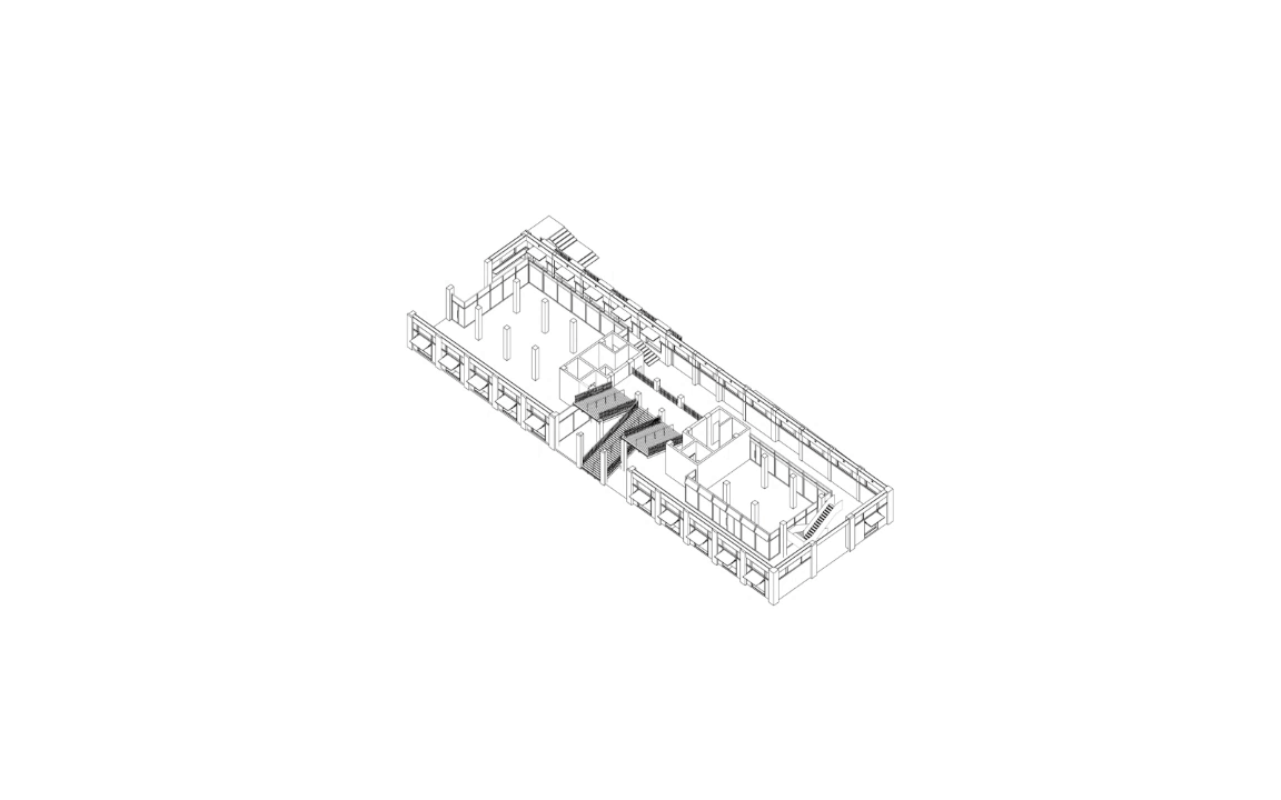 Un corridoio sopraelevato collega la torre storica, offrendo un passaggio diretto ai piani superiori. Questo sistema contrappone il flusso rapido in quota al movimento lento a livello stradale, ottimizzando la circolazione interna e risolvendo le carenze verticali del complesso. Il corridoio non solo estende le funzioni dell’edificio, ma collega anche il paesaggio circostante.